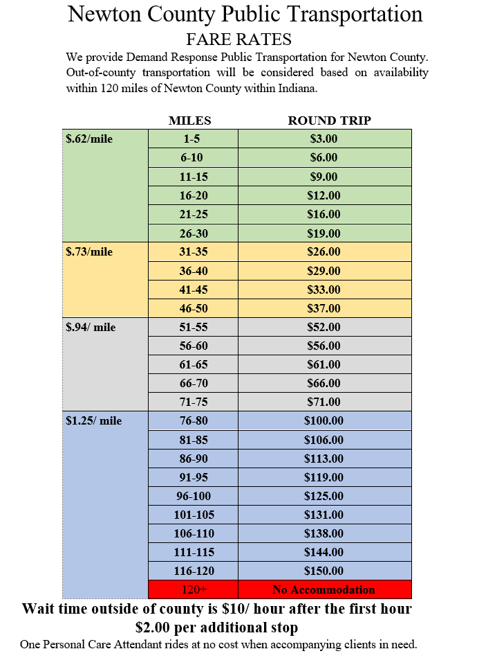 We remain committed to providing safe, reliable, and accessible transportation for Newton County residents. Our updated fare schedule offers reduced costs for shorter, local trips to help support area businesses, and adjusts rates for longer-distance travel to ensure continued service sustainability.